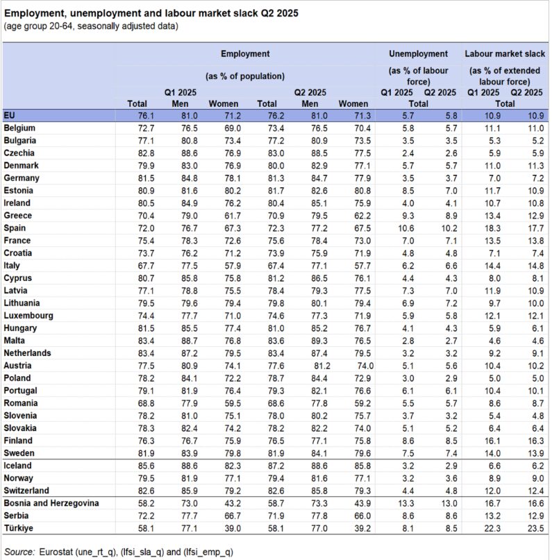 Statisticile UE arată că România este pe penultimul loc în privința ratei de ocupare a forței de muncă. Doar 68,8% din populația activă, cu vârsta între 20 și 64 de ani, are un loc de muncă, potrivit datelor Eurostat din al doilea trimestru din 2025. Față de trimestrul 4 din 2024, România este în scădere, iar scăderea a continuat și în trimestrul 2 din 2025. Această statistică arată că doar 68,8% din persoanele cu vârsta 20-64 de ani, apte de muncă, au în prezent un loc de muncă, în timp ce milioane de români sunt fără loc de muncă și nu contribuie la bugetul statului.